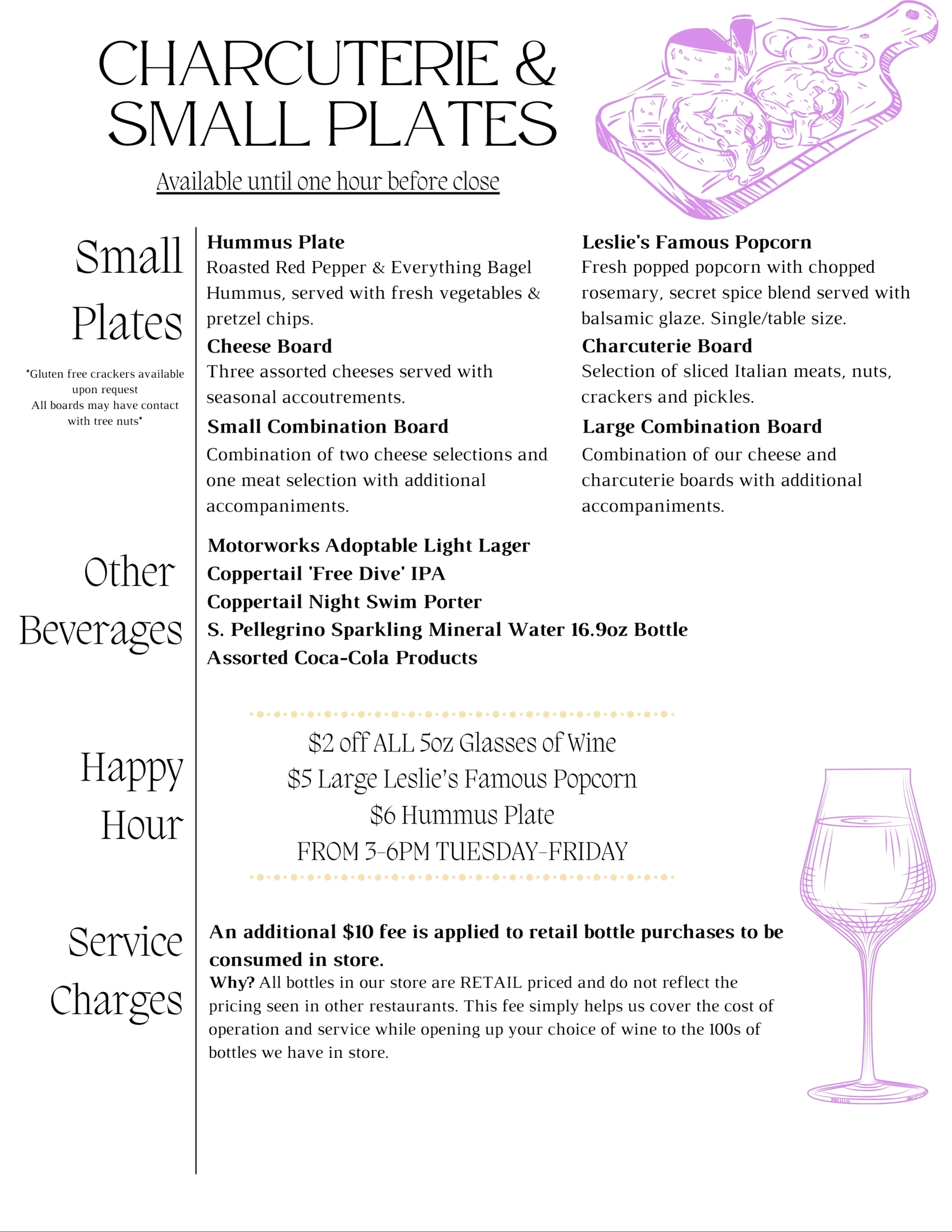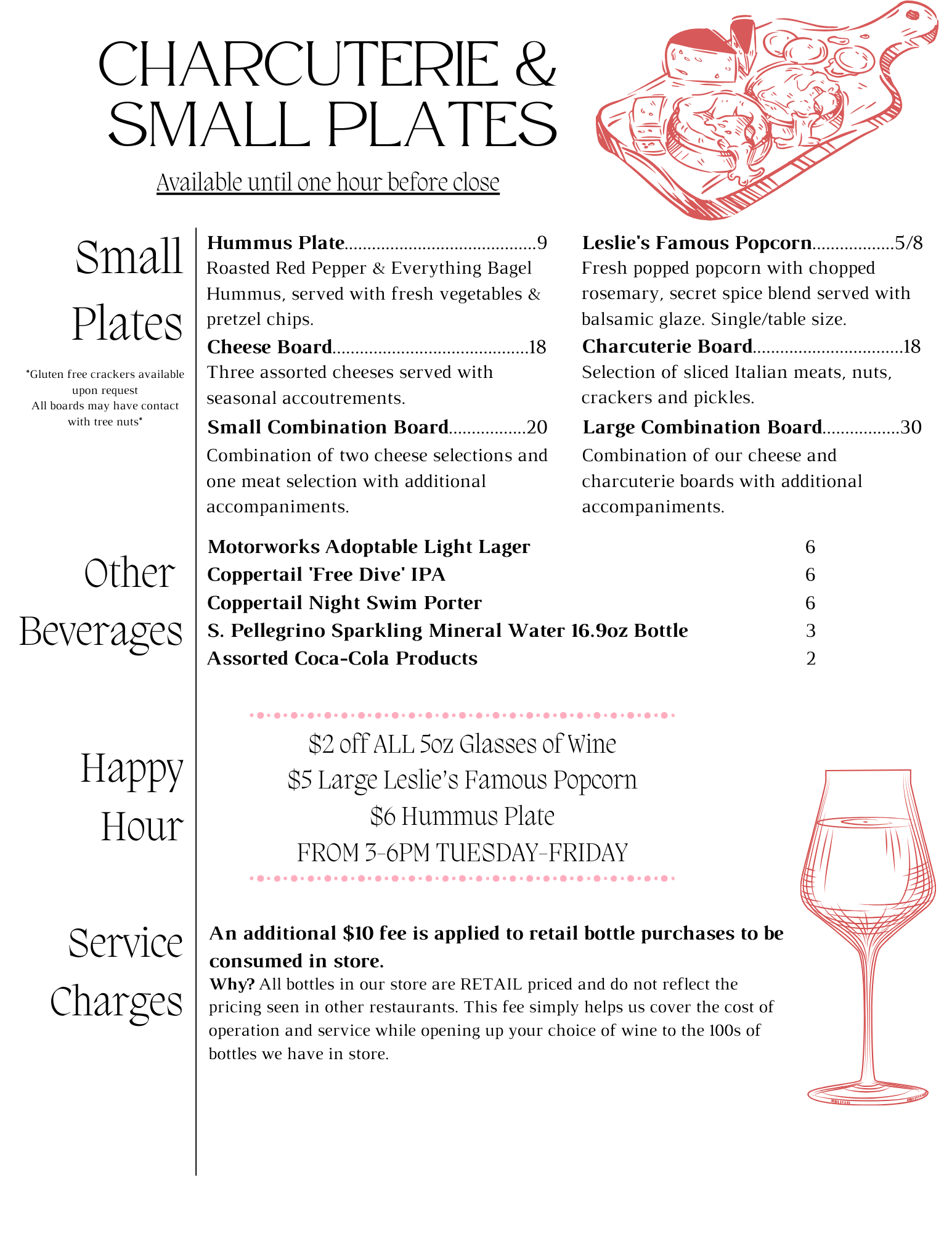 Our wine bar also offers a number of small plates including popcorn, hummus, artisanal cheese and charcuterie boards.